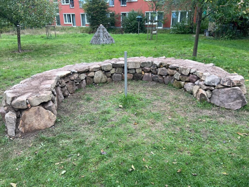 Die Trockenmauer im Heimatgarten ist fertig. ‚Steinreiche‘ Bereicherung für das Stockbrotbacken.